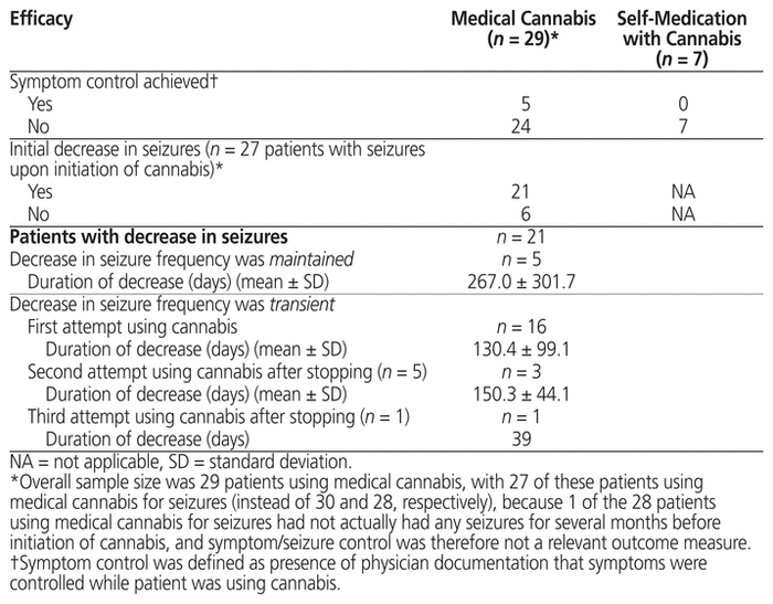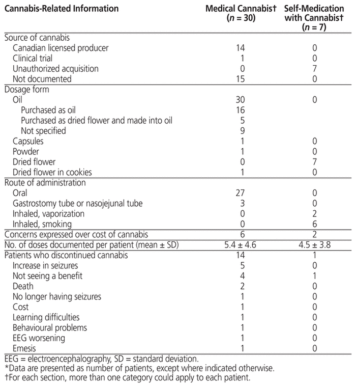 Les patients qui subissaient des crises incurables ou réfractaires utilisaient le plus souvent du cannabis sous supervision médicale. Selon ces données, la réponse aux crises est variable et les baisses initiales du nombre de crises pourraient être éphémères chez les enfants utilisant du cannabis. Il convient de préparer un dossier de soins normalisé pour mener des recherches prospectives plus cohérentes et rigoureuses et donc générer des recherches de meilleure qualité sur les effets thérapeutiques du cannabis médical.