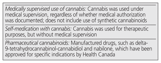 Eligible patients were categorized as either using medical cannabis (i.e., using cannabis under medical supervision) or self-medicating with cannabis (see Box 1 for definitions of terms). Patients were considered to be using cannabis under medical supervision if any of the following criteria were met (as documented in the chart): a medical authorization document was verified; the source of the cannabis was verified as a licensed producer; or a physician was supervising the cannabis use, for example, by titrating the dose. Patients were considered to be self-medicating with cannabis if there was documentation that they were using cannabis for therapeutic purposes without medical supervision.