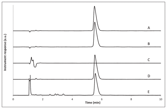 Figure 1 A: Representative chromatogram of methadone injectable solution in water (1:1) after storage at 5 °C for 4 h. B–E: Representative chromatograms of methadone injectable solution submitted to forced degradation at 60 °C for 4 h in (B) water, (C) sodium hydroxide 1 mol/L, (D) hydrochloric acid 1 mol/L, and (E) hydrogen peroxide 3%. |
