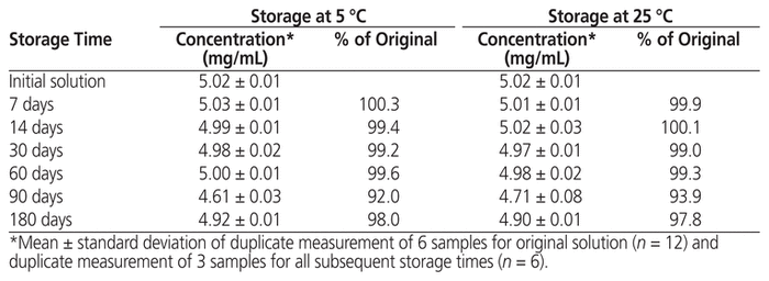 Solutions of methadone hydrochloride in saline were prepared from bulk powder and stored in clear glass vials for up to 180 days at room temperature (25 °C) or with refrigeration (5 °C), with testing on days 0, 7, 14, 30, 60, 90, and 180. The appearance of the solutions and presence of particulate matter were assessed. A stability-indicating high-performance liquid chromatography (HPLC) method was developed to assay the concentration of methadone over time.