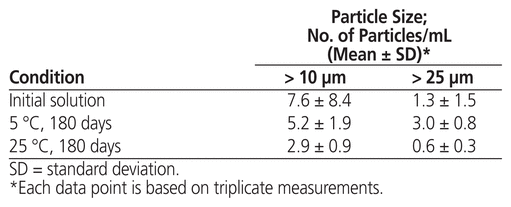 The particle count was performed initially and at the end of the study (180 days) using combined solutions from 2 vials (total volume 20 mL), repeated 3 times (i.e., total of 6 vials). To count the particles in each 20-mL sample, a first fraction (4 mL) was used to flush the instrument, then 3 counts (using 5 mL each) were performed; the remaining solution was discarded. The specification was based on test 1.B of General Chapter <788> in the United States Pharmacopeia–National Formulary, for solutions intended for injection supplied in containers smaller than 100 mL: “The preparation complies with the test if the average number of particles present in the units tested does not exceed 6000 per container equal to or greater than 10 μm and does not exceed 600 per container equal to or greater than 25 μm.”7