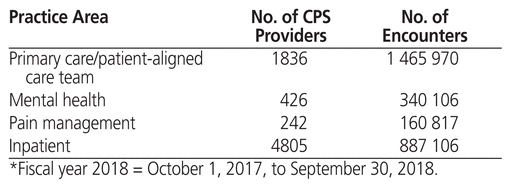 In 2017, the CPPO further enhanced practice expansion by partnering with the VHA Office of Rural Health to expand access to care for rural veterans through CPS providers. Subsequently, 65 VHA facilities received funding to hire new CPS providers: 110 in primary care, 40 in mental health, and 35 in pain management. With these new positions, as of the close of fiscal year 2018, CPS providers had served 126 095 veterans for a total of 358 243 encounters. Primary care CPS providers were involved in 177 058 of these encounters, whereas mental health CPS providers recorded 54 620 encounters and pain CPS providers had 42 379 encounters. Over 50% of encounters were conducted using virtual practice delivery modalities (e.g., telephone or clinical video telehealth).