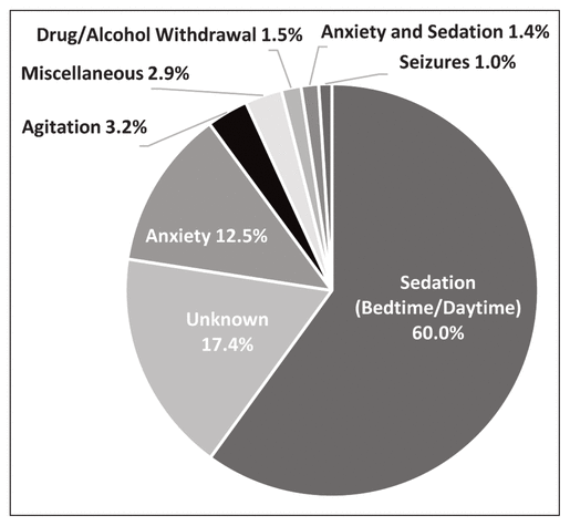 There were a total of 585 BZD/SHD orders for the 487 patients, with 92 patients (18.9%) receiving more than 1 agent. The most commonly administered drugs are shown in Figure 1. Benzodiazepines as a class were the most frequently used BZD/SHD (n = 270 [46.2%]), but the top individual agents were zopiclone (n = 187 [32.0%]), trazodone (n = 128 [21.9%]) and lorazepam (n = 128 [21.9%]). Indications for use are depicted in Figure 2. Administration for sedation (n = 351 prescriptions) occurred at bedtime (n = 336 [95.7%]), both at bedtime and in the daytime (n = 13 [3.7%]), or in the daytime only (n = 2 [0.6%]).