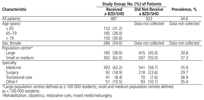 Limitations to our point prevalence survey included reliance on documentation in the health record and potential inaccuracy of data collection. We sought to minimize errors by double-checking at least 10% of charts and requiring independent data entry. Demographic characteristics (e.g., age, sex) of patients who did not receive BZD/SHDs were not collected, which restricted our analysis to those patients who used a BZD/SHD and thus limited our interpretation of the findings. As well, some drugs that might have been administered for sedation (e.g., antipsychotics, antihistamines, melatonin) were not audited. Antipsychotics are frequently prescribed to hospital patients for sedation but also for other indications.14,16 Data collection occurred during the summer months when bed occupancy may be lower; however, the sample was still expected to be representative. A point prevalence survey measures drug use at one point in time; therefore, we were not able to follow patients to discharge to determine whether BZD/SHDs were continued. Finally, we assumed that when oxazepam, z-drugs, temazepam, and trazodone were given at bedtime, they were given for sedation and not for other indications (e.g., anxiety or to manage behaviour).