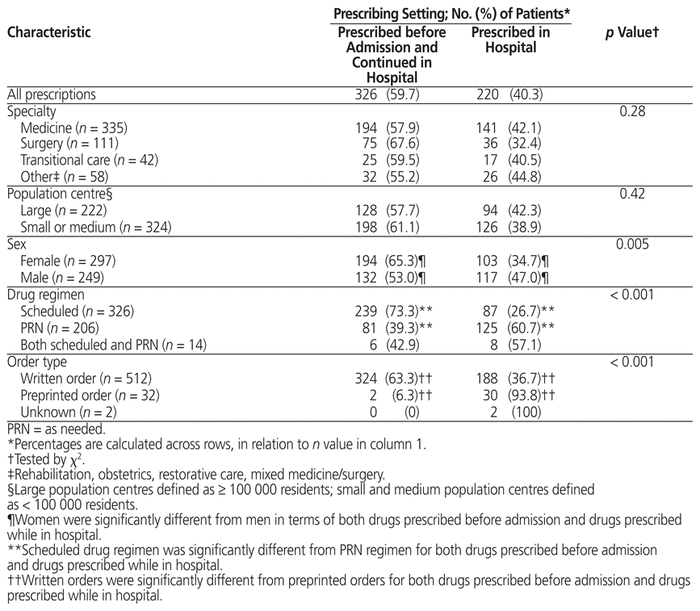 All 16 eligible hospitals participated in the point prevalence survey. Overall BZD/SHD point prevalence was 34.6% (487/1409). The point prevalence was 37.3% (302/809) for hospitals located in small and medium population centres, compared with 30.8% (185/600) for hospitals in large population centres (Table 1). Prevalence was higher among patients in transitional care (36.9% [41/111]) and medicine patients (35.9% [303/844]) than among surgical patients (29.7% [92/310]). Among the 487 patients who received a BZD/SHD, the mean age was 70.3 years (range 18–103 years), with most being over the age of 65 (n = 335 [68.8%]). The most common admitting service was medicine (n = 303 [62.2%]). Data collection by research assistants was audited by the research team for 97 (19.9%) of included patients, and any discrepancies were resolved at the time of the audit.