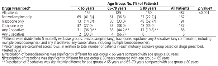 Overall BZD/SHD prevalence was 34.6% (487/1409) across the 16 eligible hospitals. The average age was 70.3 years, and 150 (30.8%) of the patients were 80 years or older. Among the 585 prescriptions for these patients, commonly used drugs were zopiclone (32.0%), lorazepam (21.9%), and trazodone (21.9%). The most common indications for use were bedtime/daytime sedation (60.0%) and anxiety (12.5%). More than half of the prescriptions (55.7%) had been initiated at home, 37.6% were started in hospital, and the place of initiation was unknown for 6.7%. Benzodiazepines were prescribed more frequently to patients under 65 years than those 80 years or older (41.3% versus 22.2%, p < 0.001) whereas trazodone was more frequently prescribed to the older of these 2 age groups (52.7% versus 14.3%, p < 0.001).
