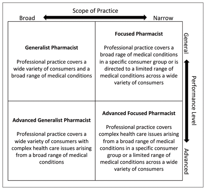 In defining advanced pharmacist practice, the Needs Assessment of Specialization in Pharmacy in Canada adopted the APPF’s definition of advanced practice.9,32 Although the Needs Assessment recognized the importance of distinguishing between advanced pharmacist practice and specialty practice, it did include components of advanced practice within its definition of pharmacist specialists. It defined pharmacist specialists as pharmacists who “ maintain an active clinical practice that is limited to a particular type of patients …, part of the body …, or location of practice. … Pharmacy specialization requires an advanced body of knowledge distinct of the general practitioner and a specialized or enhanced depth of competency including knowledge, skills, attitudes and accountabilities based on the physical, social, and health sciences, sufficient to manage the most complex of cases and provide clinical leadership in the field.”32 Despite the lengthy definition of pharmacist specialists used in the Needs Assessment, there are clearly elements of the Australian definition of advanced practice embedded within it. Both definitions highlight that advanced competencies are required, extending beyond just knowledge. Limitations of the definitions of advanced pharmacy practice and pharmacist specialists in the Needs Assessment include the potential confusion created by overlapping definitions, as well as the fact that pharmacist specialists appear to include clinical practitioners only.