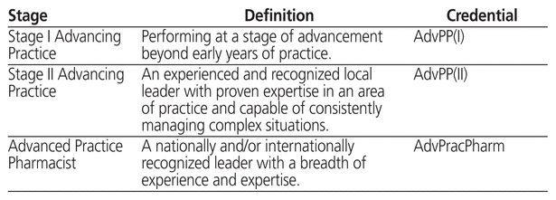 The first steps for the Australian pharmacy profession were to define advanced practice and develop a framework outlining such a practice. The APPF, released in 2012, described advanced practice as “practice that is so significantly different from that achieved at initial registration that it warrants recognition by professional peers and the public of the expertise of the practitioner and the education, training and experience from which that capability was derived.”9