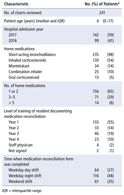 A total of 328 charts for pediatric inpatients with asthma admitted between January 2016 and December 2017 were identified. Of these, 241 charts had asthma medications listed on the admission form and were included for review. Short-acting bronchodilators constituted the most common class of medication, with 235 (98%) of the charts mentioning this class as a home medication. The second most common medication class was inhaled corticosteroids (130 [54%]). More than half (133 [55%]) of the admission forms were completed by first-year medical residents, who provide on-call coverage for the inpatient medical unit at our centre more frequently than later-year residents. Other demographic data are presented in Table 1.