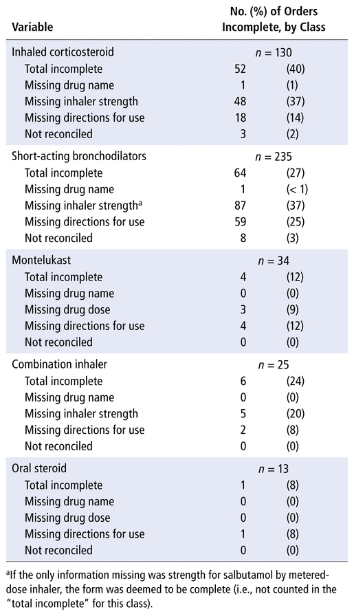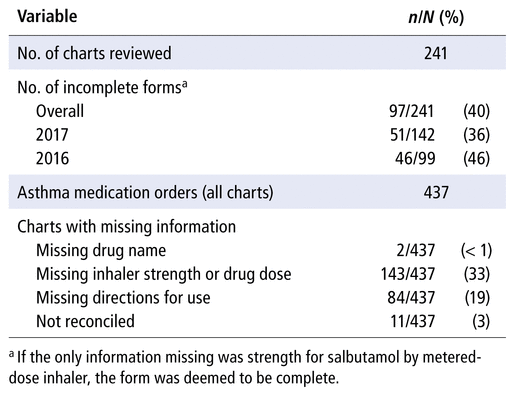 This single-centre, retrospective chart review evaluated documentation of admission medication reconciliation for pediatric inpatients with asthma who were admitted between January 2016 and December 2017. Medication reconciliation forms were deemed incomplete if records for asthma medications were missing drug name, inhaler strength or oral drug dose, directions for use, or evidence of reconciliation.