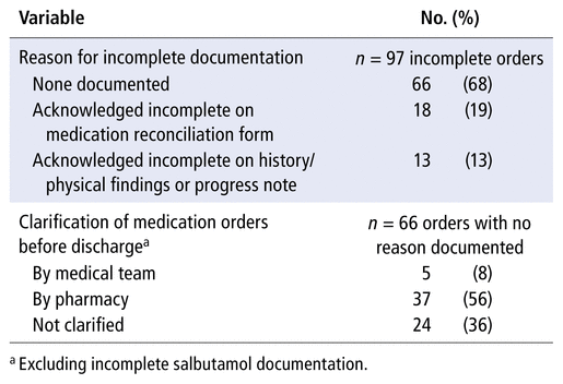 The 97 charts with incomplete documentation of medication reconciliation were further reviewed to determine whether the prescriber acknowledged that the medication history was incomplete; for 19% (18/97), such acknowledgement appeared on the medication reconciliation form, and for 13% (13/97), it appeared in the history and physical or progress notes. The remaining 66 charts (68%) had no documented reason for or acknowledgement of the incomplete orders. Reasons for missing information about patients’ home medications as recorded in the charts included “patient/family unsure of dose”, “parent does not have puffers”, “clarify in the morning”, and “pharmacy to clarify”. Upon review of the 66 charts with incomplete medication reconciliation (excluding the 31 charts with only incomplete salbutamol documentation), 37 (56%) were clarified by pharmacy before discharge, 5 (8%) were clarified by the medical team before discharge, and 24 (36%) were not clarified (Table 4).