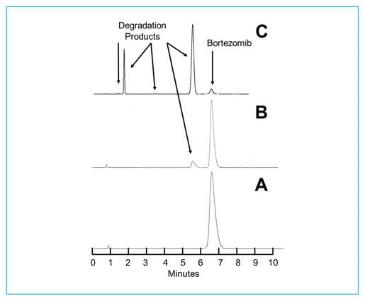 As a result of the chromatographic separation of these degradation products from bortezomib, and the similarity of the UV spectrum (200–365 nm) between an authentic standard and bortezomib in a degraded sample, it was concluded that this was a stability-indicating analytical method.13–15