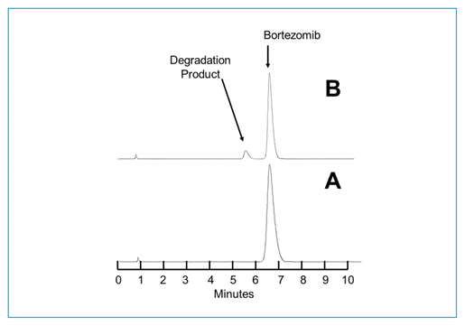 FIGURE 2 Chromatograms of bortezomib 2.5 mg/mL, reconstituted in normal saline and stored in syringes at room temperature (25°C) during the MDA stability study. (A) On study day 0. (B) After 84 days of storage at room temperature. Very small amounts of a degradation product originally observed during the accelerated degradation study were observed in solutions stored at room temperature. |