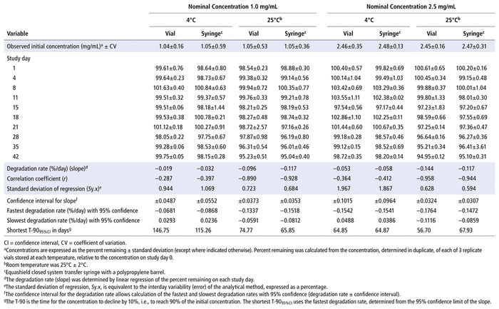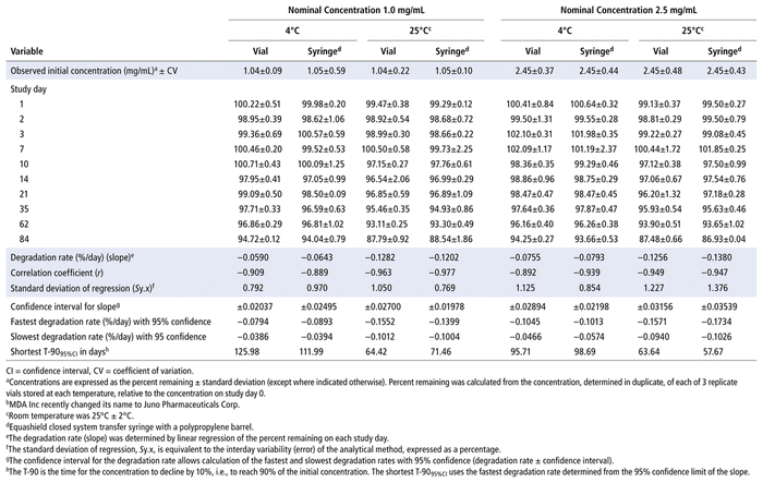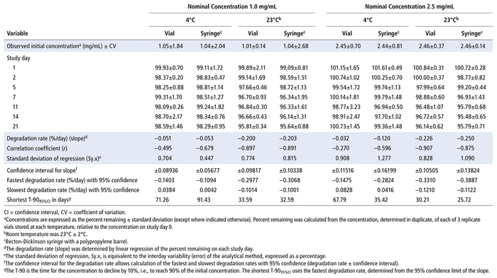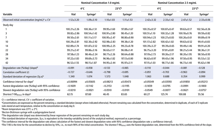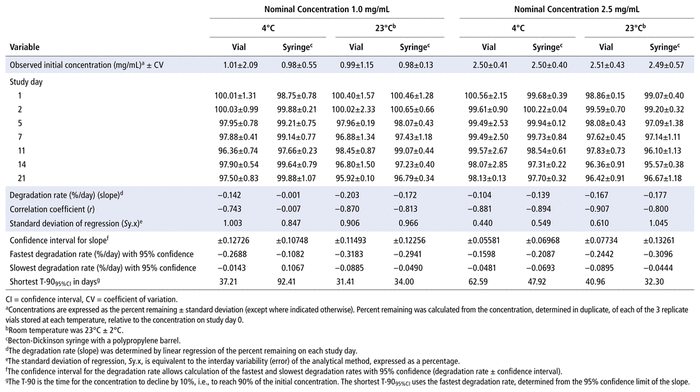 After determining the CV of the assay, a power calculation showed that duplicate injection had the ability to distinguish between concentrations that differed by at least 10% within each type of container.17,19 Means were calculated for replicate analyses. Mean results from different days for each test were compared statistically to determine whether an association existed between the observed result and time. The percent remaining was analyzed by linear regression, and a 95% confidence interval (CI) was constructed around the slope of percent remaining versus study days. The time to reach 90% of the initial concentration (T-90) with 95% confidence (expressed as “T-9095%CI”) was calculated from the time (in days) for the lower limit of the 95% CI to reach 90%. Analysis of variance was used to test differences in concentration on different study days, with different initial nominal concentrations, different containers, and different storage temperatures. The 5% level was used as the a priori cut-off for significance.