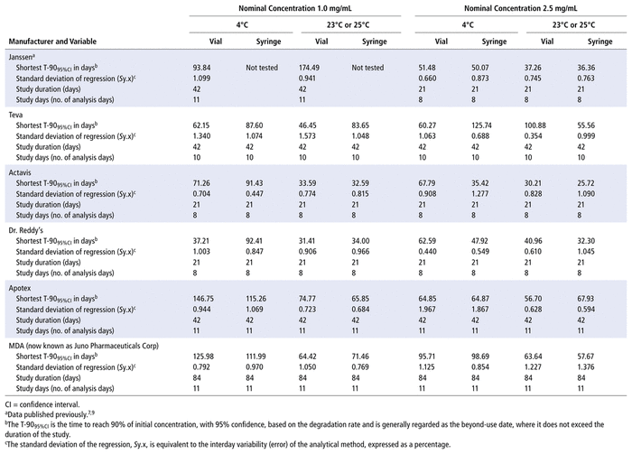 Identifying potential differences in stability between manufacturers was also an objective of this study. Bortezomib stability data for the Janssen formulation (the innovator product) for the 1.0 mg/mL concentration (published in 2008)7 and the 2.5 mg/mL concentration (published in 2014)9 were included in the evaluation. The primary end point of all of the individual studies was the time to reach 90% of the initial concentration, with 95% confidence (T-9095%CI). This end point involves the construction of a confidence interval; therefore, although the value of T-9095%CI is based on the change in percent remaining (degradation rate, expressed as percentage per day), it is also a function of variability in the data (standard deviation of regression) and number of study days (ranging between 8 and 11). To ensure homogeneity of the data across all 6 formulations, the standard deviation of regression observed for each combination of initial nominal concentration, container type, storage temperature, and manufacturer was compared using analysis of variance and linear regression.
