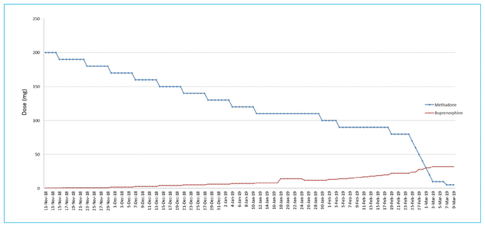 At the time of initiation of buprenorphine/naloxone, in November 2018, the client was receiving 200 mg of methadone daily. The combination product was initiated at 0.5 mg of buprenorphine and 0.125 mg of naloxone daily, and the client did not report any withdrawal symptoms. Buprenorphine/naloxone was increased to 1/0.25 mg daily after 5 days, and the dose was then increased by 1/0.25 mg weekly until the dose of 8/2 mg daily was reached. Concurrently, the methadone dose was decreased by 10 mg weekly. As such, after 8 weeks of therapy (in early 2019), the client was receiving 8 mg of buprenorphine, 2 mg of naloxone (in combination), and 110 mg of methadone daily.