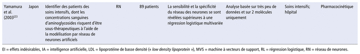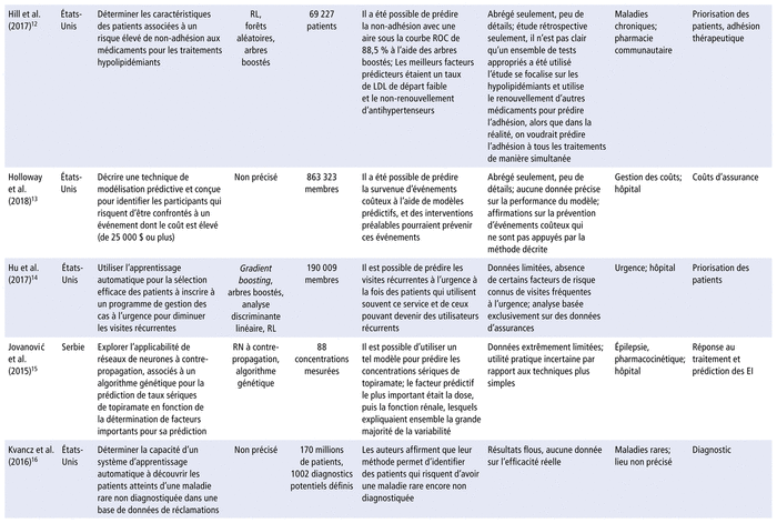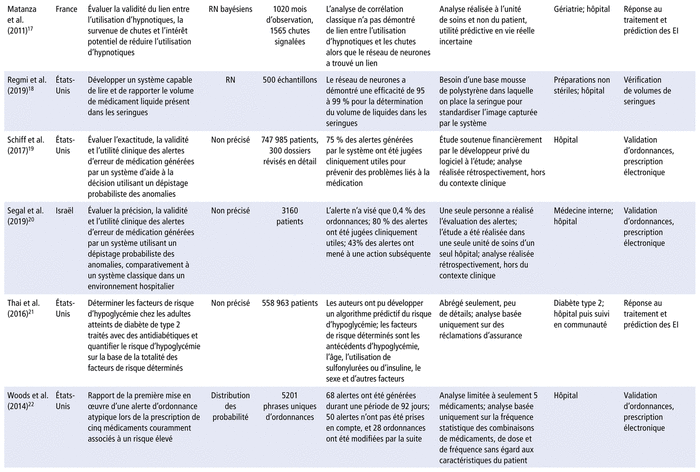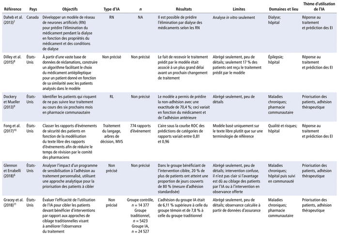 Le tableau 1 présente un profil synthèse des études6–23 évaluant la faisabilité et l’impact de l’IA en pharmacie.