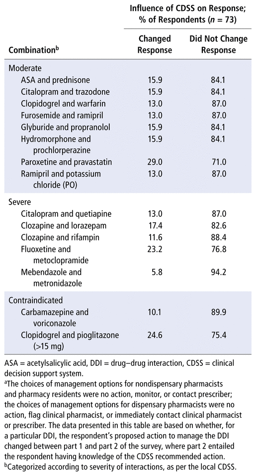 Another limitation to the survey design was administration of part 2 immediately after part 1. The participants might have recalled their responses from the first part of the survey, which could have affected their responses in the second part, resulting in an underestimate of the impact of the CDSS on clinical decision-making. Furthermore, no clinical context was provided, so responses might have varied depending on the area of practice and expertise of the individual participants. The dose, duration, and frequency for each DDI were also not provided to participants, because the CDSS often does not take into consideration the dosing regimens. For almost all DDIs in the survey, the CDSS severity ranking would be the same, regardless of dose, duration, or frequency. One exception is the DDI involving clopidogrel and pioglitazone, which is categorized as contraindicated if the dose of pioglitazone is greater than 15 mg. In the open-text field at the end of the survey, a number of participants expressed that frequency, dose, and duration of therapy would greatly affect their approach to managing each DDI. For consistency, we did not provide dosing information for any of the DDIs. Therefore, the results may vary depending on assumptions about dosing regimens that participants made while completing the survey. Our rationale for this aspect of survey design was to allow our results to be generalizable and to reflect the reality of the CDSS, which does not take into consideration the clinical context, dosing regimen, or patient-specific factors.