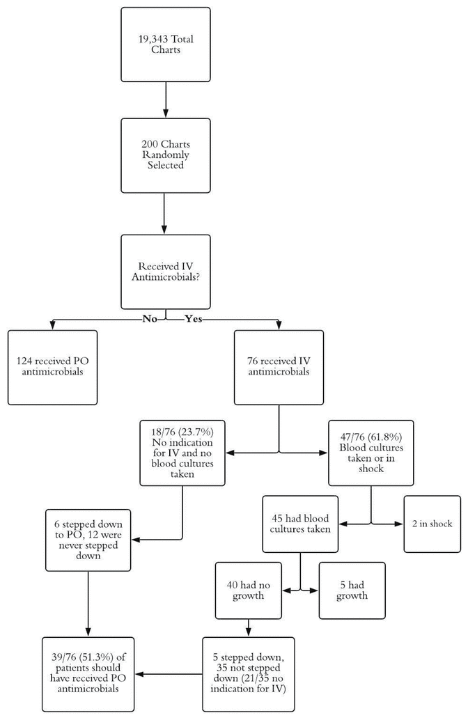 Of the 200 charts initially selected for review, using site-based, proportional, systematic random sampling, 13 documented an order for an antimicrobial that was not administered; data were not collected for those patients, and in each case the next randomized chart from the same hospital was selected. Of the final sample of 200 patients, 124 (62.0%) received PO antimicrobials, while the remaining 76 (38.0%) received IV medications (Table 1, Figure 1).