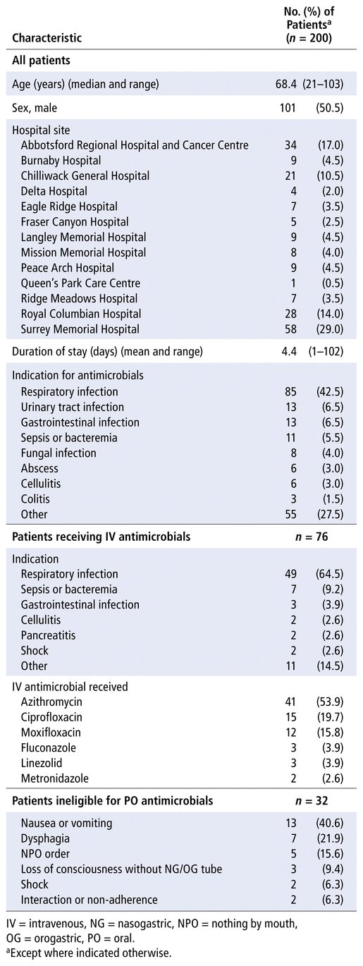 According to a draft document entitled Sequential Antimicrobial Therapy in Adults – Best Practice Recommendations , prepared in 2020 by the BC Health Authorities Pharmacy & Therapeutics Committee, the criteria for initiating or converting to PO administration are defined as the absence of nausea, vomiting, dysphagia, gastrointestinal (GI) bleeding, loss of consciousness without a nasogastric or orogastric tube present, poorly functioning GI tract (ileus, GI obstruction, short GI transit time, malabsorption, gastrectomy, short bowel syndrome), or any significant drug interactions between a fluoroquinolone and enteral formula. Additionally, patients had to be able to tolerate other oral medications and a solid or liquid diet. Those in shock and receiving vasopressors, as well as those with conditions that could only be treated with IV antimicrobials (e.g., meningitis), were considered ineligible for PO therapy. Only descriptive statistics were used.
