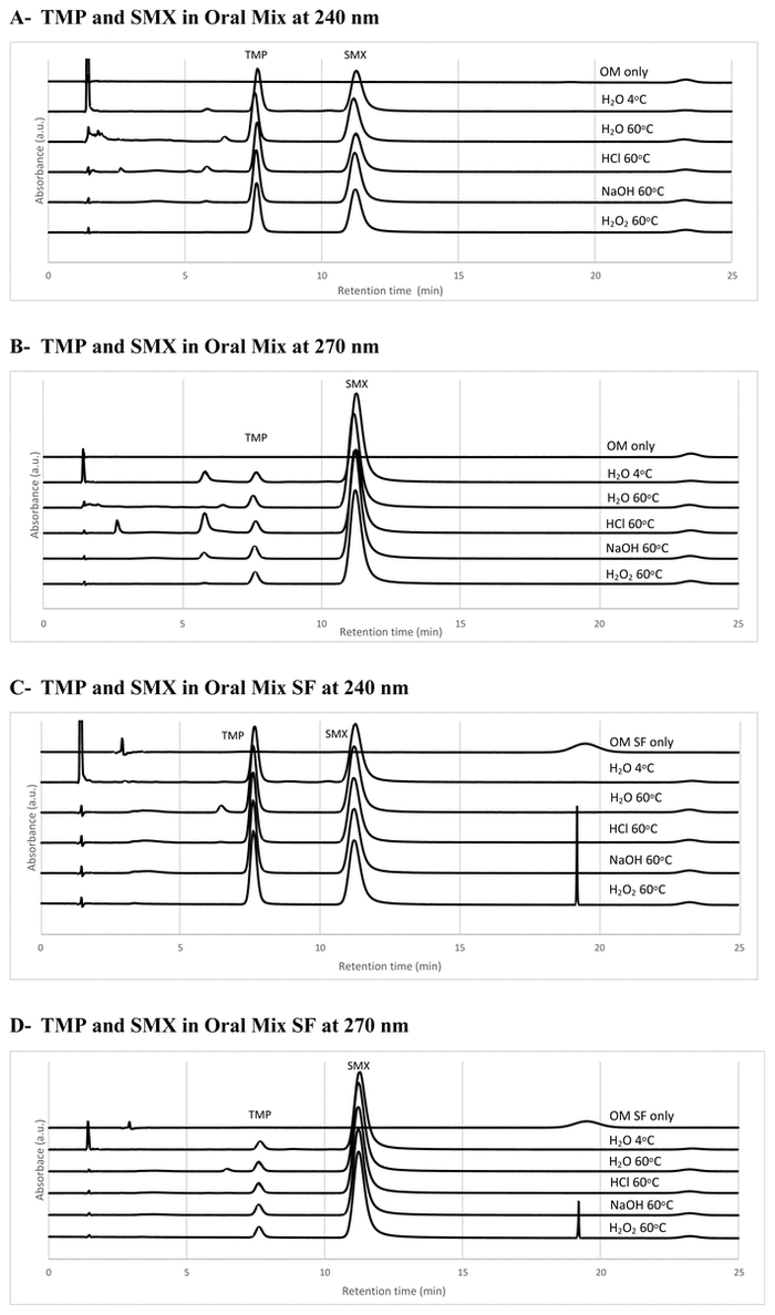 In Oral Mix vehicle, the peak for TMP was not reduced in water, HCl, or NaOH and was reduced by 14% in H 2 O 2 ; in Oral Mix SF vehicle, the peak for TMP was reduced by 2% in water, 5% in HCl, 10% in NaOH, and 22% in H 2 O 2 (Figure 1). In Oral Mix vehicle, the peak for SMX was not reduced in water or NaOH and was reduced by 11% in HCl and 6% in H 2 O 2 ; in Oral Mix SF vehicle, the peak for SMX was not reduced in water, HCl, or NaOH and was reduced by 9% in H 2 O 2 (Figure 1). Furthermore, no interference from vehicles was observed, as shown in the chromatogram with water at 4°C in Figure 1. The HPLC method was therefore considered stability-indicating.