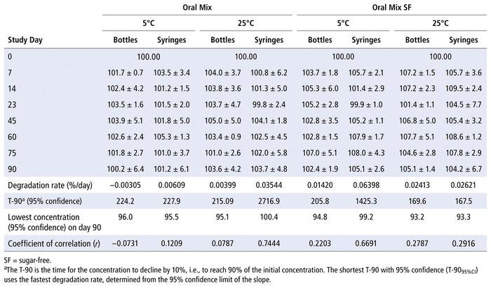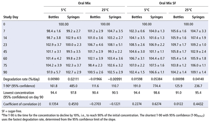 Analysis of the concentration results support a before-use date (BUD) of 90 days at both temperatures and with all combinations of container and suspending agent.