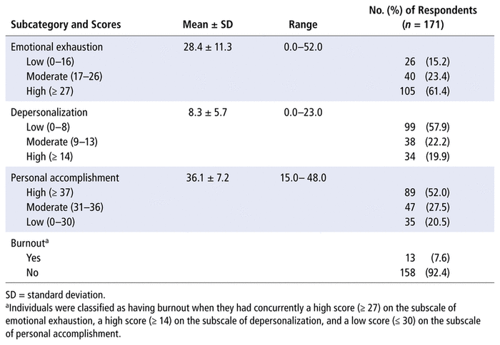 Scores for the individual subscales, defined according to the previously mentioned thresholds, are shown in Table 4. More than half of the respondents (61.4%, 105/171) met the burnout threshold on the emotional exhaustion subscale, 19.9% (34/171) met the burnout threshold on the depersonalization subscale, and 20.5% (35/171) met the burnout threshold on the personal accomplishment subscale. Internal consistency for the MBI-HSSMP subcategories was assessed using the Cronbach α and were found to be moderate to high (α = 0.92 for emotional exhaustion subscale, α = 0.73 for depersonalization subscale, and α = 0.79 for personal accomplishment subscale).