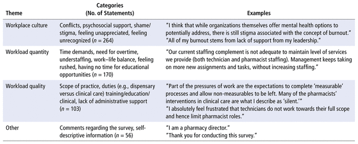 Overall, 44.4% (264/594) of the responses were categorized in the theme of workplace culture, 28.6% (170/594) in the theme of workload quantity, and 17.3% (103/594) in the theme of workload quality. Of the 97 pharmacists who provided responses to the open-ended question, 78 made at least 1 statement regarding workplace culture, 58 made at least 1 statement regarding workload quantity, and 42 made at least 1 statement regarding workload quality. Details about the content of the themes and examples of responses provided are presented in Table 5.