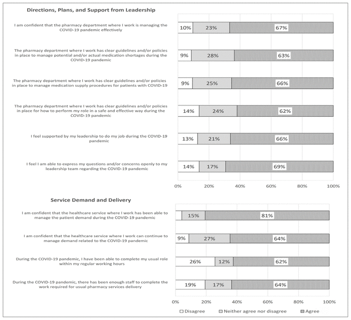Two-thirds of respondents (67%) agreed that they felt confident that their pharmacy department had been managing the pandemic effectively (Figure 1). Furthermore, almost two-thirds of respondents (62%–66%) agreed that clear guidelines and policies had been implemented to manage medication shortages and medication supply procedures and to inform pharmacists of how to practise in a safe and effective way. Overall, about two-thirds of respondents (66%–69%) felt supported by their leadership throughout the pandemic and were able to openly express any questions or concerns.