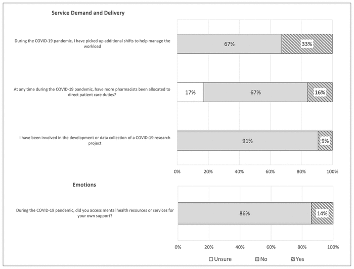 Part A of the survey sought pharmacists’ perceptions of their workplace preparedness. This 46-item validated survey went through 2 stages of development. During the first phase, the team searched out relevant questionnaires from the literature, and created new questions; the draft survey was then piloted by the investigators. Permission was obtained from the World Health Organization (WHO) to adapt and include questions from its research protocol entitled “Perceptions of Health Workers Regarding Local Infection Prevention and Control Procedures for COVID-19”.9 The survey questions were revised to reflect pilot feedback, and revised versions were then tested for internal validity with 3 pharmacists and 1 nonpharmacist researcher to ensure understandability of content, readability, clarity, and acceptability. The survey included a variety of multiple-choice, yes/no/unsure, and 3-point Likert-scale questions (with options of agree, neither agree nor disagree, disagree) and contained 8 main sections: demographic characteristics (10 items); experience during COVID-19 or previous pandemics (5 items); directions, plans, and support from leadership (6 items); service demand and delivery (8 items); personal protective equipment (PPE) practices (2 items); beliefs about capabilities, social/professional role, and teamwork/work environment (7 items); educational resources (2 items); and emotions (6 items).
