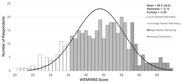 FIGURE 3 Distribution of scores on the Warwick-Edinburgh Mental Well-being Scale (WEMWBS). The cut points were defined on the basis of 1 standard deviation above and below the mean, as outlined by the WEMWBS analysis guidelines.13 | ||