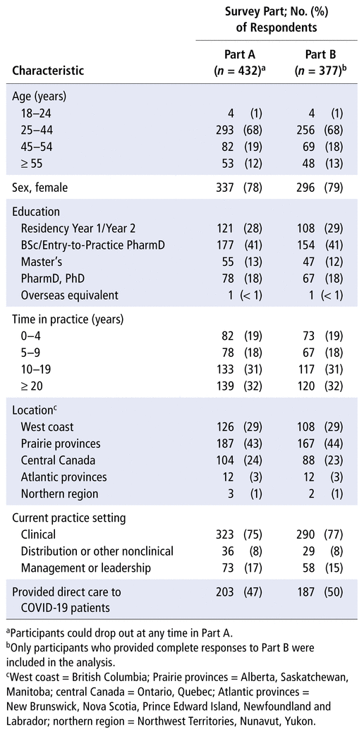 A total of 432 inpatient hospital pharmacists provided responses to some or all questions in Part A of the survey, for an estimated response rate of about 6.5% (based on data available from the National Association of Pharmacy Regulatory Authorities14). A total of 377 inpatient hospital pharmacists provided complete responses in Part B, for an estimated response rate of about 5.7%. Complete data for demographic characteristics are presented in Table 1. For both Part A and Part B, respondents were predominantly women, and most respondents were 25–44 years of age. Although most respondents worked in a clinical practice setting with at least 10 years of pharmacy practice experience, only about half had provided direct care to COVID-19 patients. Overall, the majority of respondents were from the Prairie provinces (Alberta, Saskatchewan, Manitoba), followed by the west coast (British Columbia) and central Canada (Ontario, Quebec).