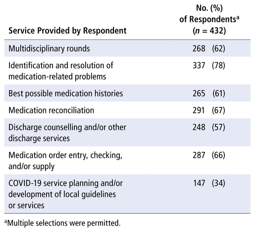 More than three-quarters of respondents (78%) continued to identify and resolve medication-related problems during the pandemic (Table 2). Furthermore, medication reconciliation was still provided by two-thirds (67%) of respondents, while discharge counselling and other services were provided by 57%.