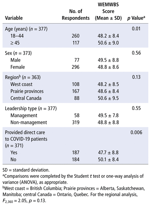 The mean WEMWBS score, based on data supplied in Part B of the survey questionnaire, was 48.9 (standard deviation 8.6) (Figure 3), which suggests average mental well-being. For this cohort, the cut points for low, average, and high mental well-being were determined to be 40 or below, 41 to 57, and 58 or above, respectively. When stratified by regions of Canada, hospital pharmacist respondents from the west coast, the Prairie provinces, and central Canada all showed average well-being, with no statistically significant differences (F2,360 = 2.05, p = 0.13) (Table 4); the sample sizes from the Atlantic and Northern regions were too small to be included in this analysis. However, respondents between the ages of 18 and 44 years had significantly lower scores than respondents aged 45 years or older; similarly, respondents who provided direct care to COVID-19 patients had significantly lower scores than those who did not directly care for COVID-19 patients (Table 4).