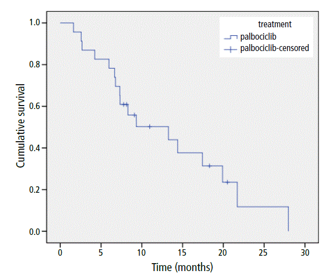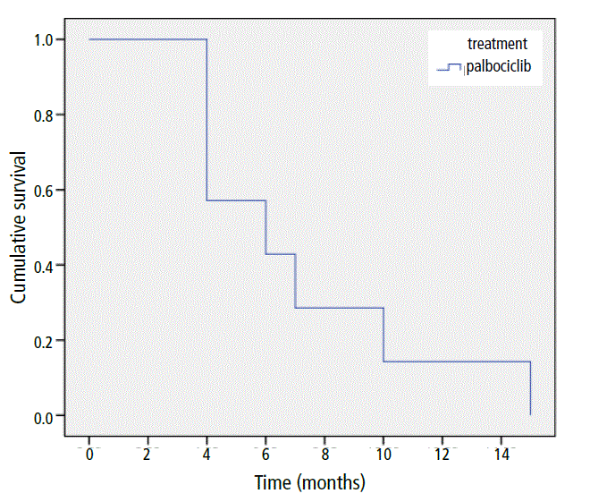 By the end of the follow-up period, overall median progression-free survival with palbociclib therapy was 14.4 months (95% confidence interval [CI] 6.2–22.2 months) (Figure 1).