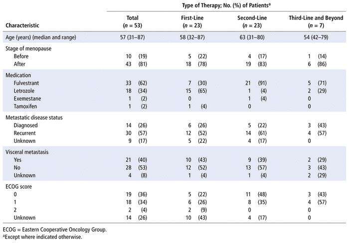 During the study period (April 2017 to September 2019), 53 patients with HR-positive, HER2-negative metastatic breast cancer, all of them women, were treated at the 3 study hospitals. Mean age was 57 years (range 31–87 years). Clinical and demographic characteristics are presented in Table 1.