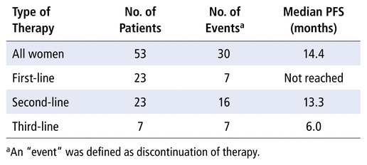 Women treated with palbociclib as first-line therapy in our study had characteristics similar to those of patients in the PALOMA-2 trial (a phase 3 clinical trial), in which palbociclib and letrozole were administered as first-line therapy.4 In our study, 65% of the 23 women treated with palbociclib as first-line therapy received letrozole. Progression-free survival was 24.8 months in the PALOMA-2 trial,4 whereas in our study progression-free survival was not achieved with palbociclib as first-line therapy. However, because we evaluated results from a real-world setting, our population might have included patients not fit enough to participate in clinical trials, leading to these disparate results. Wilkie and others15 included women treated with aromatase inhibitors as first-line therapy and observed progression-free survival of 26.4 months. The cohort studied by Varella and others11 included 57 patients treated with palbociclib and letrozole as first-line therapy, who had shorter progression-free survival (15.1 months). In our study, women who received palbociclib as first-line therapy had a median treatment duration of 12.1 months; further study, with longer follow-up, will be required to properly assess progression-free survival in this population.