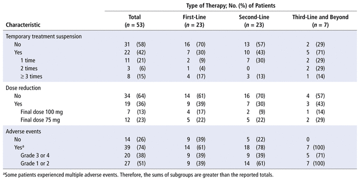 In scenarios with long post-progression survival, it is important to keep in mind the balance between incremental gain in progression-free survival and the appearance of toxic effects.14 We measured toxic effects by assessing temporary discontinuations of therapy, dose reductions, and adverse events.