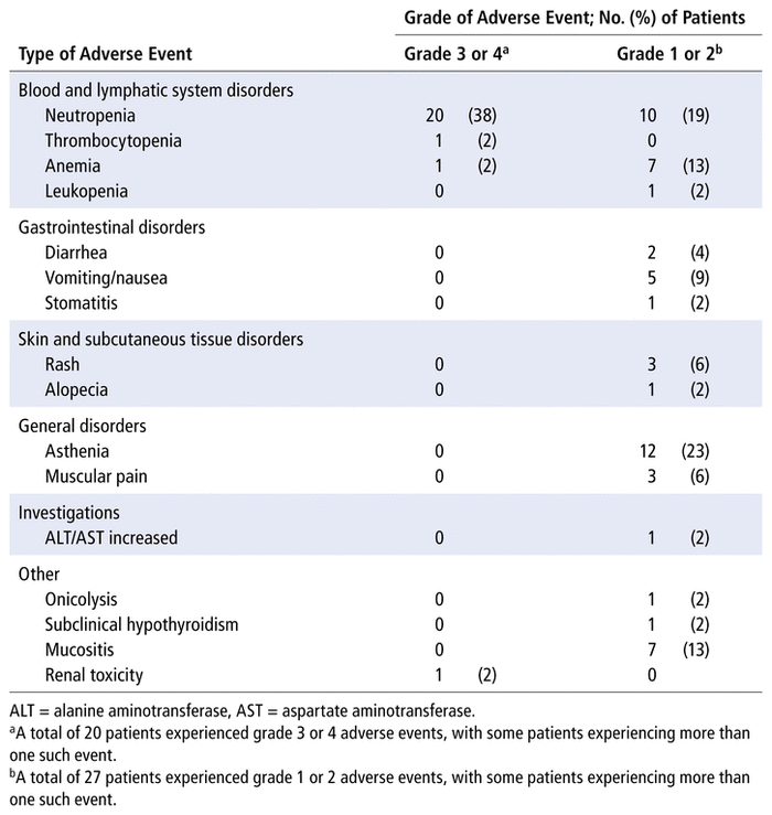 Adverse events of any grade were described for 39 patients (74%). For 27 patients (51%), the adverse events were grade 1 or 2, most commonly asthenia (in 12 patients, 23%) and neutropenia (in 10 patients, 19%). Grade 3 or 4 adverse events were reported in 20 patients (38%), all of whom experienced neutropenia. Table 4 shows the severity and prevalence of adverse events in our population.