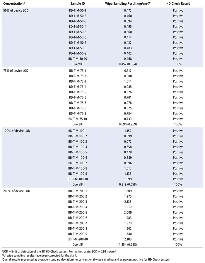 With the HD Check assay for MTX, positive results were obtained in every test trial at all drug concentrations examined. In other words, the assay was able to detect positive contamination at concentrations less than its LOD (specifically, 50% and 75% of 0.93 ng/cm2). The corresponding average MTX concentrations detected by conventional wipe sampling and analysis were as follows: 0.457 ng/cm2 at 50% of the LOD, 0.690 ng/cm2 at 75% of the LOD, 0.919 ng/cm2 at 100% of the LOD, and 1.854 ng/cm2 at 200% of the LOD (Table 1).