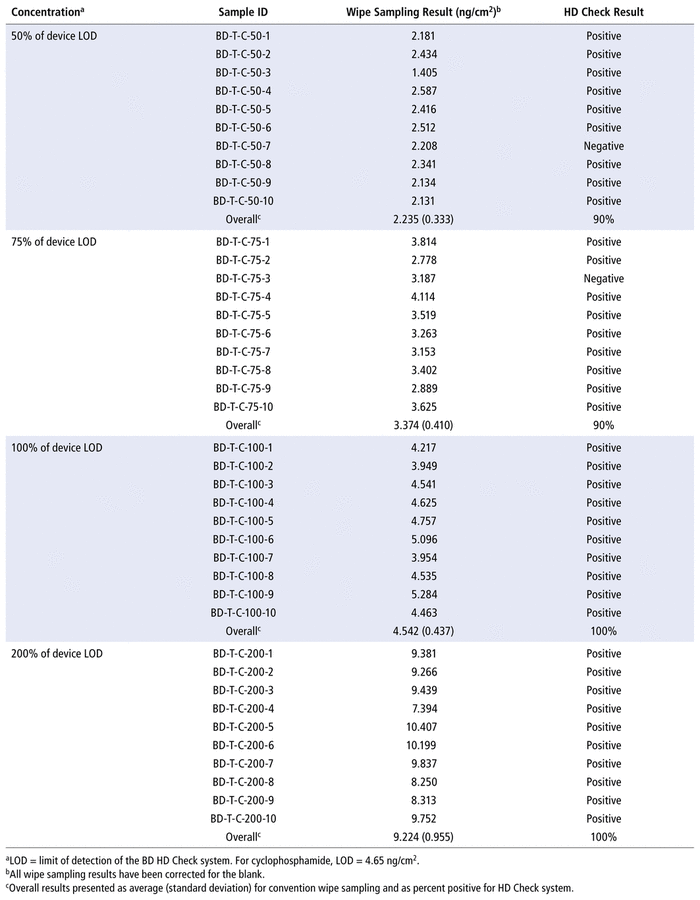 For both MTX and CP, the following 5 concentrations were assessed: 0 ng/cm2 (control/blank), 50% of the limit of detection (LOD) of the corresponding HD Check system, 75% of the LOD of the HD Check system, the LOD of the HD Check system, and twice (200%) the LOD of the HD Check system. The manufacturer’s LOD was 0.93 ng/cm2 for the MTX HD Check system and 4.65 ng/cm2 for the CP HD Check system.