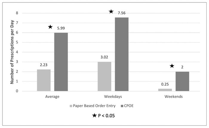 The analysis included t tests to determine whether there was a significant difference in mean number of total orders prescribed per clinical pharmacist before and after CPOE implementation. For all secondary outcomes, a Z test was performed to determine whether there was a significant difference in proportion of orders placed in each group before and after CPOE implementation. Statistical significance was determined by p values less than 0.05.