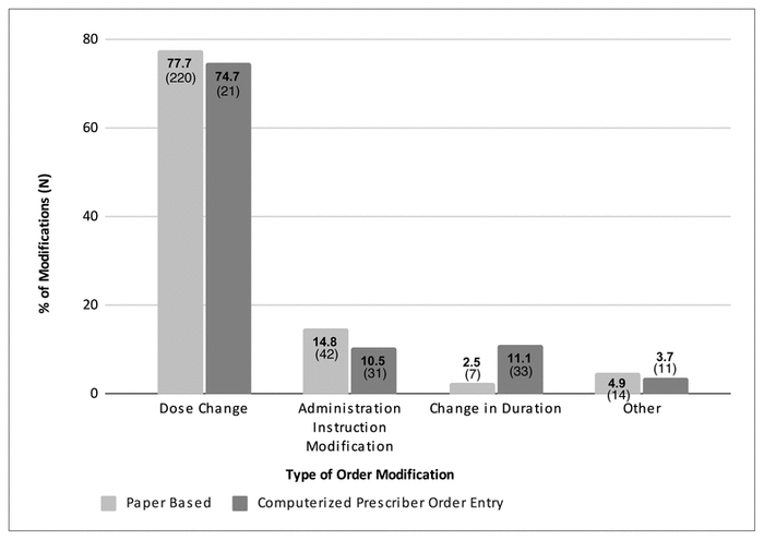 FIGURE 2 Modification types in paper-based and computerized prescriber order entry periods, expressed as proportion of all modifications. | ||