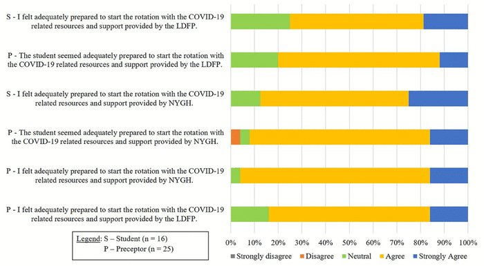 Most participants felt that the COVID-19 resources and supports provided by U of T and NYGH adequately prepared them for their rotations and made them feel safe. However, 1 participant commented that a discussion of workflow changes and expectations during orientation would have been helpful. Some preceptors were unaware of the COVID-19–specific resources that were available to students. Given the ever-changing information and protocols, timely development, implementation, and dissemination of information was a challenge. Ideally, a central internet site for both NYGH and U of T, dedicated to COVID-19–related questions and resources, might have been beneficial, especially at the start of learner reintegration. However, during the latter part of the academic year, both the university and the hospital had developed separate learner-dedicated websites with COVID-19–related rotation information.