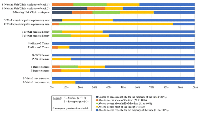 Participants were asked to indicate the amount of time they were able to access computer terminals on site, applications such as Microsoft Teams, and online resources by remote access. The results are illustrated in Figure 2. With respect to workspace and computer terminal access in the hospital, preceptors consistently perceived these resources to be less accessible than did students. All student respondents indicated that they were able to reliably access Microsoft Teams, the NYGH email system, and virtual care resources (where applicable) the majority of the time. A few participants reported problems with remote access. One person was able to use remote access only some of the time, whereas 2 indicated they had access about half the time. Specific problems with electronic tools were delays in registration or initial set-up, a delay in resolving a particular problem, inconsistency in remote access, and connectivity problems when using a particular tool. Positive feedback and suggested improvements from students and preceptors are summarized in Table 3.