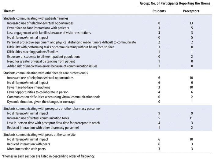 Perceptions of how interactions with patients and families, other health care providers and interprofessional collaborators, preceptors and other pharmacy personnel, and peers differed during the pandemic were elicited in this part of the questionnaire. Table 4 summarizes the themes identified and their respective frequencies, based on comments from student and preceptor respondents.