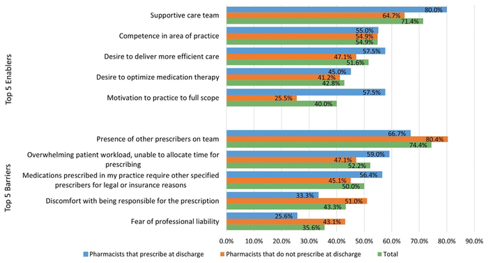 The top 3 enabling factors reported by all respondents were a supportive care team (71.4% of respondents), competence in area of practice (54.9%), and desire to deliver more efficient care (51.6%) (Figure 1). Conversely, the top 3 barriers to prescribing at discharge were the presence of other prescribers on the team (74.4%), overwhelming patient workload (i.e., unable to allocate time for prescribing) (52.2%), and being unable to prescribe medications commonly used in participants’ practice for legal or insurance reasons (50.0%) (Figure 1). “Motivation to practise to full scope” was a much more common enabler among those who prescribed than among those who did not prescribe (57.5% vs 25.5%), whereas larger proportions of pharmacists who did not prescribe at discharge selected “discomfort with being responsible for the prescription” and “fear of professional liability” relative to pharmacists who did prescribe at discharge (51.0% vs 33.3% and 43.1% vs 25.6%, respectively).