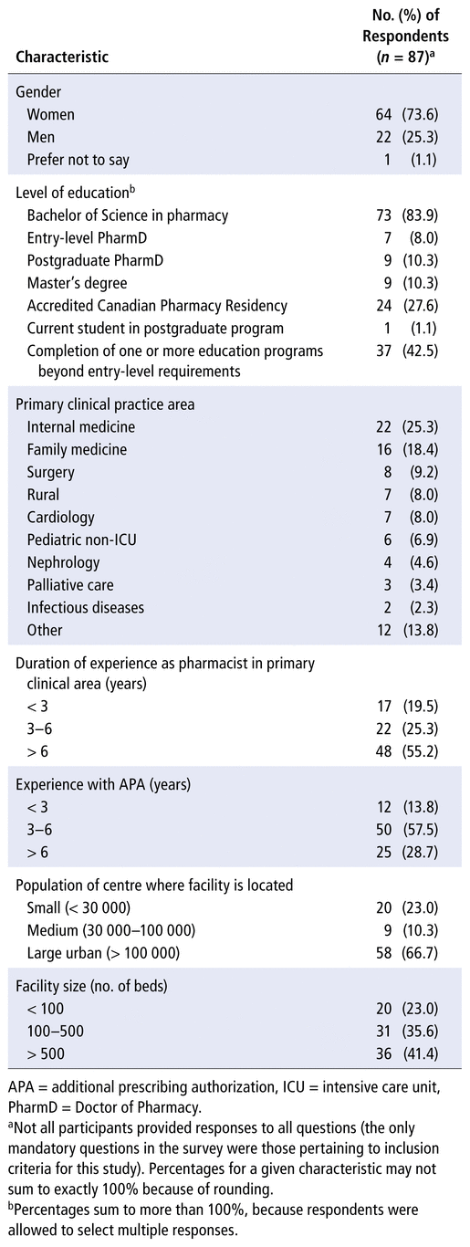 The survey was sent via email to more than 1200 AHS and Covenant Health pharmacists. The number of pharmacists who are clinically deployed or who participate in the discharge process within these organizations could not be specifically defined; as such, respondents were asked to self-assess their eligibility for the survey. A total of 121 pharmacists responded, for an approximate survey response rate of 22% (based on the estimated 544 eligible participants). Of these, 17 were excluded because they did not meet the inclusion criteria (Supplementary Figure 1, available from https://www.cjhp-online.ca/index.php/cjhp/issue/view/216). Of the included pharmacists, most were women (73.6%), most were from a large urban population centre (66.7%), and 42.5% indicated completion of education beyond the entry-level requirements to be a pharmacist (Table 1). The respondents represented diverse clinical backgrounds, and most had been practising with APA for at least 3 years.