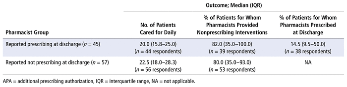 Of the 102 respondents who answered questions about their prescribing activities at discharge, 45 (44.1%) reported using their APA to prescribe at discharge. These pharmacists reported prescribing for a median of 14.5% (interquartile range [IQR] 9.5%–50.0%) of their patients (Table 2). These respondents reported caring for a median of 20 (IQR 15.8–25.0) patients daily, whereas pharmacists who reported not prescribing at discharge cared for a median of 22.5 (IQR 18.0–28.3) patients daily. The 2 groups of pharmacists (those who did and did not prescribe at discharge) offered nonprescribing interventions to a median of 82.0% (IQR 35.0–100.0%) and 80.0% (IQR 35.0–93.0%) of their patients, respectively. The 3 most common nonprescribing interventions (based on 93 respondents) were coordinating with community pharmacy/other outpatient providers to ensure continuity of care (95.7%), coordination of outpatient coverage (84.9%), and comprehensive discharge counselling (83.9%) (Supplementary Table 1, available from https://www.cjhp-online.ca/index.php/cjhp/issue/view/216). The order of most commonly provided interventions was almost identical between the 2 groups, except that preparing discharge prescriptions to be signed by another prescriber was the second most frequently selected option among pharmacists who did not prescribe at discharge, but the sixth most frequently selected among those who did prescribe at discharge. Telephone follow-up with patients was selected by almost triple the number of pharmacists who prescribed at discharge relative to those who did not prescribe at discharge (11 vs 4).