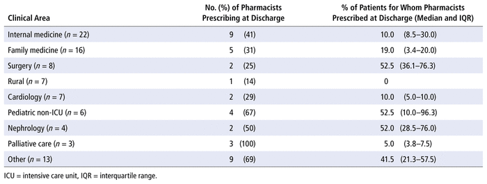 With regard to population size, pharmacists from centres with small populations (fewer than 30 000 people) prescribed at discharge for a median of 10.5% (IQR 0.3%–20.0%) of their patients, and those in centres with medium populations (30 000 to 100 000 people) prescribed at discharge for a median of 30.0% (IQR 17.5–45.0%) of their patients (Supplementary Table 2, available from https://www.cjhp-online.ca/index.php/cjhp/issue/view/216). For centres with large populations (more than 100 000 people), pharmacists prescribing at discharge could be stratified into 2 groups: those working in facilities with 100–500 beds prescribed at discharge for 10.0% (IQR 10.0%–41.5%) of patients, and those working in facilities with more than 500 beds prescribed for 22.0% (IQR 10.0%–57.5%) of patients. According to responses categorized by practice area, larger proportions of pharmacists reported prescribing at discharge in areas such as palliative care (100%), pediatric non–intensive care units (67%), and nephrology (50%); however, this does not mean that they prescribed for all patients under their care. In fact, there was high variability in the proportions of patients for whom they prescribed: 5.0% (IQR 3.8%–7.5%), 52.5% (IQR 10.0%–96.3%), and 52.0% (IQR 28.5%–76.0%), respectively (Table 3).